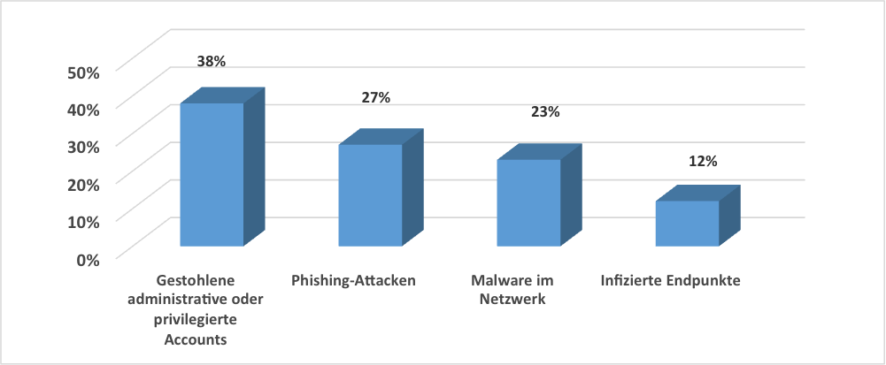 Die Mehrheit der Befragten sieht die größte generelle Sicherheitsbedrohung in gestohlenen privilegierten oder administrativen Accounts (38 %). 27 % nannten Phishing-Attacken und 23 % Malware im Netzwerk. Auch auf die Frage, welche Attacken am schwierigsten aufzudecken und zu beheben sind, wurde die missbräuchliche Nutzung privilegierter Accounts mit deutlichem Abstand am häufigsten genannt (61 %); im Vorjahr lag dieser Wert noch bei lediglich 44 %. An zweiter Stelle liegt hier weit abgeschlagen die Malware-Installation mit 21 %.
