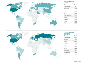 Cryptomining ist ein weltweites Phänomen, auch wenn die dominierende Anzahl an Aktivitäten im Untersuchungszeitraum in den USA beobachtet werden konnten, gefolgt von der Schweiz. Nach Brasilien und Indien folgen weitere europäische Länder, wie Spanien, England im vorderen Teil des Rankings. Allerdings reicht die Anzahl der Schürf-Zugriffe in Europa über alle Länder hinweg noch nicht an die Gesamtzahl in den USA heran. Bei den Cryptomining-Servern folgt Deutschland schon hinter den USA und auf den Rängen Russland und weitere osteuropäische Länder.