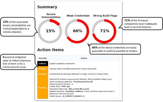 Eine effektive Möglichkeit, die Gefährdung durch das IoT-Risiko zu verringern, besteht darin, eine Sicherheitsrisikobewertung der IoT-Geräte-Firmware im Vorfeld durchzuführen. Solche Bewertungen können IoT-Herstellern helfen, Geräte mit besserer Sicherheitshaltung freizugeben, ihren Kunden einen Sicherheitsfrieden zu bieten und auch die neu entstehenden IoT-Sicherheitsvorschriften zu erfüllen (z.B. CA SB 327, aktiv seit Januar 2020 in Kalifornien). Diese Risikobewertung kann IT-Organisationen auch dabei helfen, bessere Sicherheitsentscheidungen zu treffen, bevor sie neue IoT-Geräte kaufen oder in ihr Netzwerk integrieren. Verschiedene Lösungen ermöglichen die Erstellung von detaillierten IoT-Firmware Risikobewertungsberichten für jedes Gerät. Dieser Bericht spiegelt eine firmware-spezifische Risikobewertung wider, die auf aktuellen und umfassenden IoT-spezifischen Behandlungsinformationen basiert. Mit einem Cloud-basierten Service können sowohl IoT-Entwickler als auch IT-Manager einen solchen Bericht innerhalb von Minuten erstellen, ohne den Quellcode der Firmware zu benötigen.
