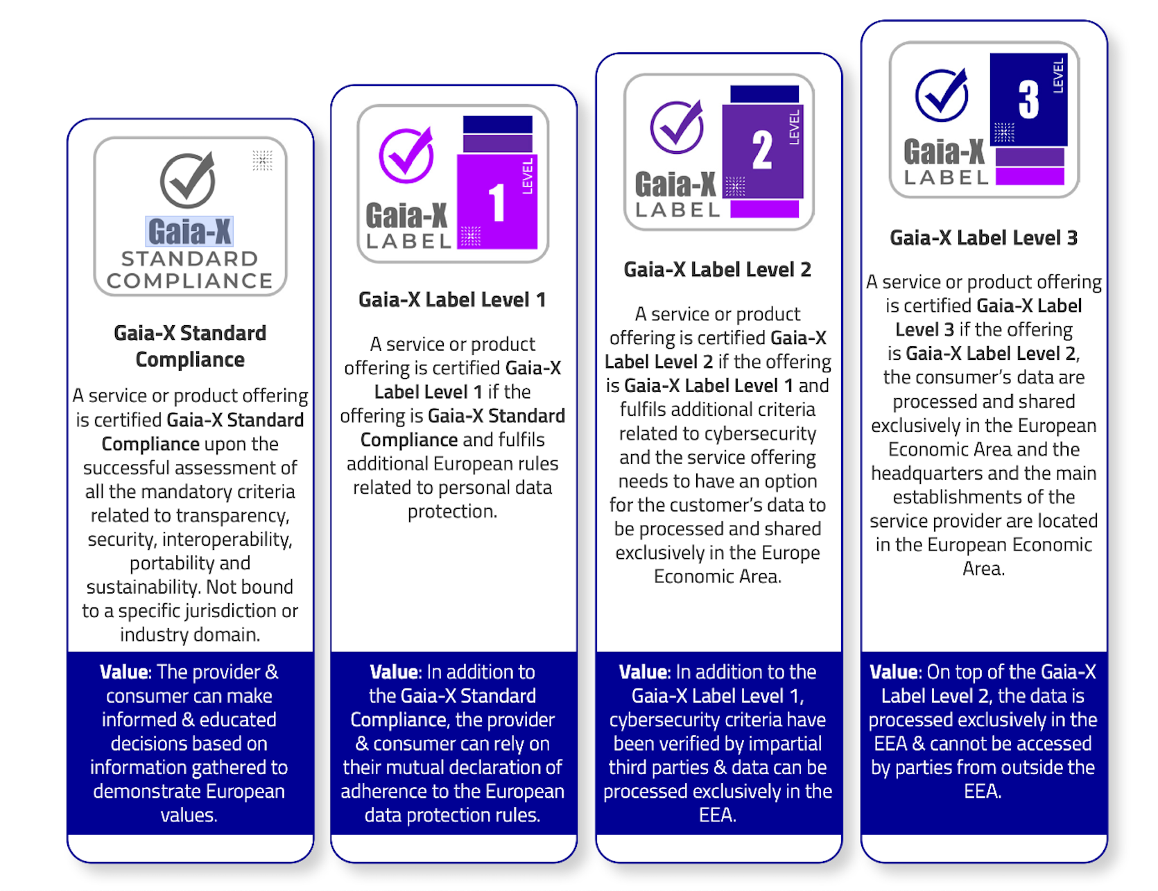 2. Labels zur Differenzierung: Gaia-X führt die Standardkonformität für Cloud-Dienste sowie 3 optionale Labelstufen ein, beginnend mit Label Level 1 (der niedrigsten Stufe) bis hin zu Label Level 3 (der höchsten Stufe), die verschiedene Grad der Compliance in Bezug auf Transparenz, Autonomie, Datenschutz, Sicherheit, Interoperabilität, Portabilität, Nachhaltigkeit und europäische Kontrolle darstellen.