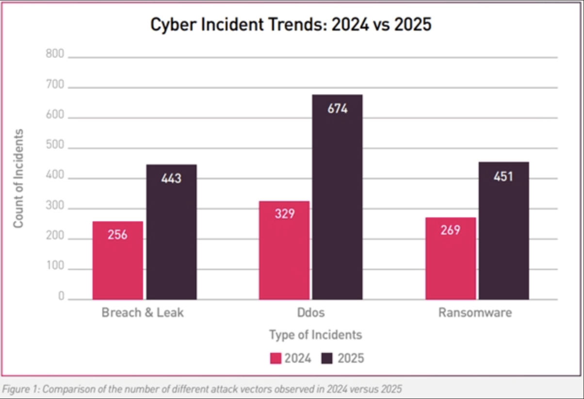 Datenverstöße und -lecks stiegen von 256 Vorfällen im Jahr 2024 auf 443 im Jahr 2025 stark an, was systemische Schwächen in den Bereichen Identitätsmanagement, Cloud-Umgebungen und Integrationen von Drittanbietern deutlich machte. Im Gegensatz zu DDoS-Angriffen, die auf schnelle, öffentliche Störungen abzielen, waren diese Intrusion-Kampagnen weitgehend heimlich. Sie umfassten oft langfristigen Zugriff, stille Datenexfiltration und verzögerte Offenlegung.