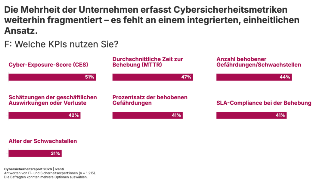 - Die am häufigsten genutzten Messgrößen spiegeln keinen Risiko-Kontext wider. Nur 60 % der Sicherheitsexperten nutzen Analysen, die sich mit den Auswirkungen auf das Unternehmen befassen, um ihre Risikopriorisierung zu bestimmen. Tatsächlich nutzen nur knapp die Hälfte der Unternehmen (51 %) einen Cybersicherheits-Exposure-Score bzw. einen risikobasierten Index. Viele setzen hingegen immer noch auf Prozessmetriken wie „durchschnittliche Zeit bis zur Behebung“ (47 %) oder den Prozentsatz behobener Gefährdungen (41 %). Das Problem liegt darin, dass diese Kennzahlen, die sich auf Geschwindigkeit und Anzahl der Behebungen konzentrieren, isoliert betrachtet positiv aussehen können. Sie sagen jedoch wenig darüber aus, ob Behebungsmaßnahmen die Risikoposition tatsächlich verbessern.