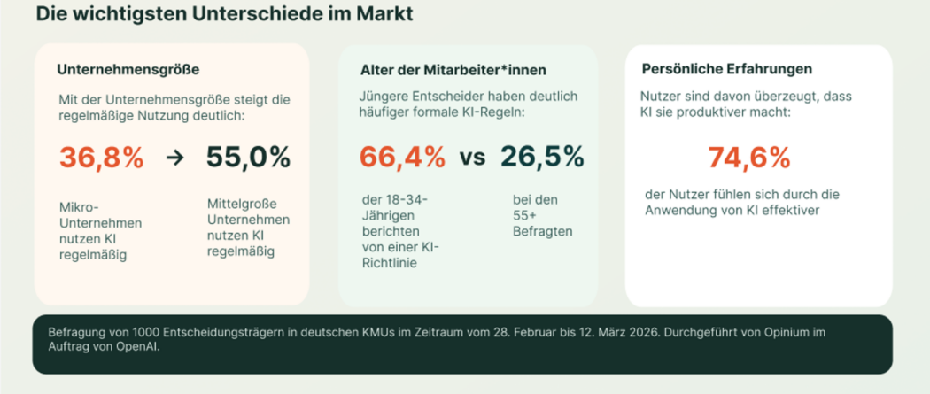 So berichten 66,4 Prozent der 18- bis 34-Jährigen von formalen KI-Richtlinien im Unternehmen, während dieser Anteil bei den über 55-Jährigen lediglich bei 26,5 Prozent liegt. Auch die Unternehmensgröße spielt eine Rolle: Während 36,8 Prozent der Kleinstunternehmen KI regelmäßig einsetzen, liegt der Anteil bei mittelgroßen Unternehmen bereits bei 55 Prozent.
